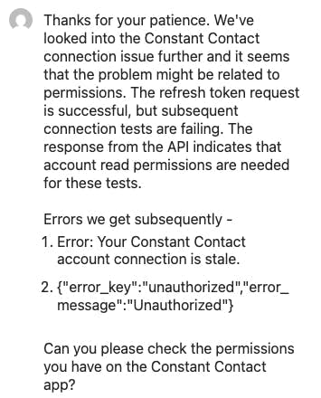 Thanks for your patience. We've looked into the Constant Contact connection issue further and it seems that the problem might be related to permissions. The refresh token request is successful, but subsequent connection tests are failing. The response from the API indicates that account read permissions are needed for these tests. Errors we get subsequently -