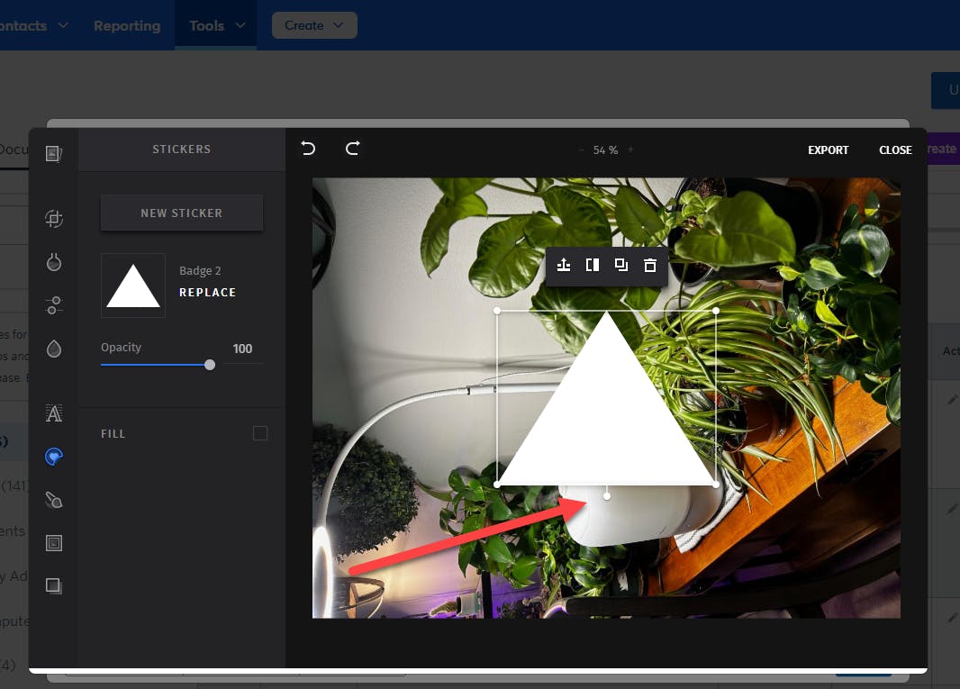 If you are using a clickable image to direct your contacts to an externally hosted video other than the ones listed above, you can use the Image Editor to place a triangle over the photo, similar to a play icon. You will rotate the sticker 90 degrees to the left to have it appear as a play icon by clicking and dragging the small circle below the sticker. Click Export to save the photo and then you can use it in your email.