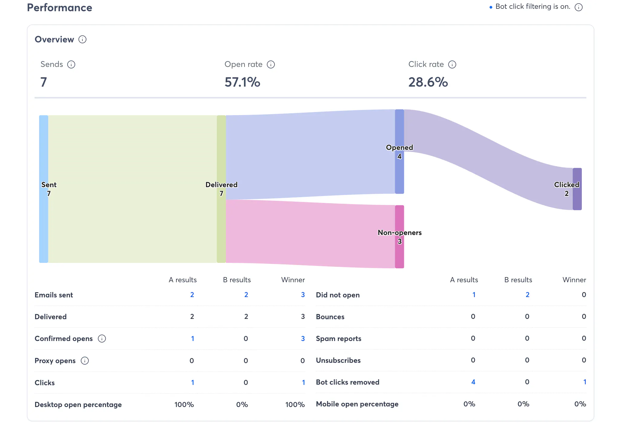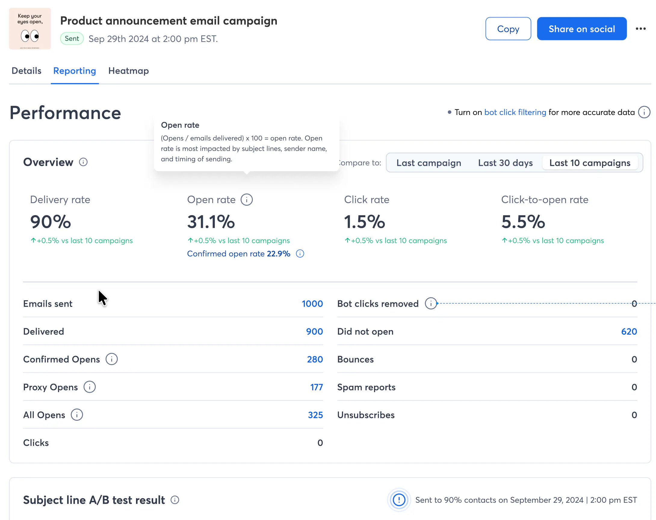 As of last night (February 24th, 2026), the Reporting team has released a new column view that will let you see all of these stats side-by-side. Everyone using Resend to Non-openers and/or A/B Subject Line testing with an email should see the columns appear when looking at that email's reporting details.