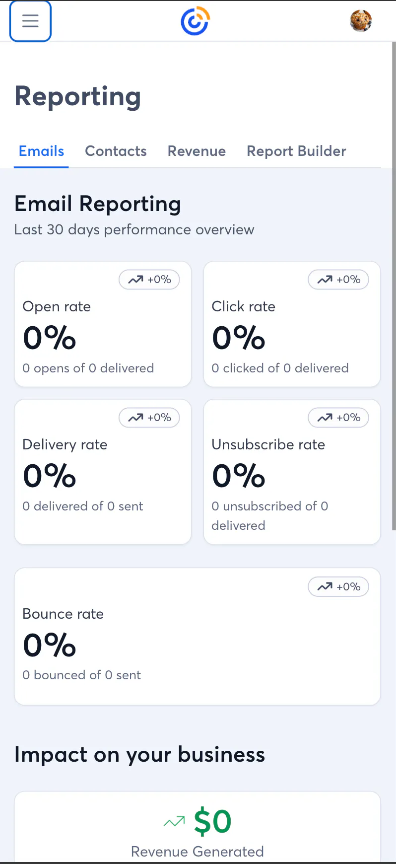Once you log in to constantcontact.com on your mobile browser, you'll see that we've added a Reporting option to the navigation on the left. Just tap it to access reporting stats.