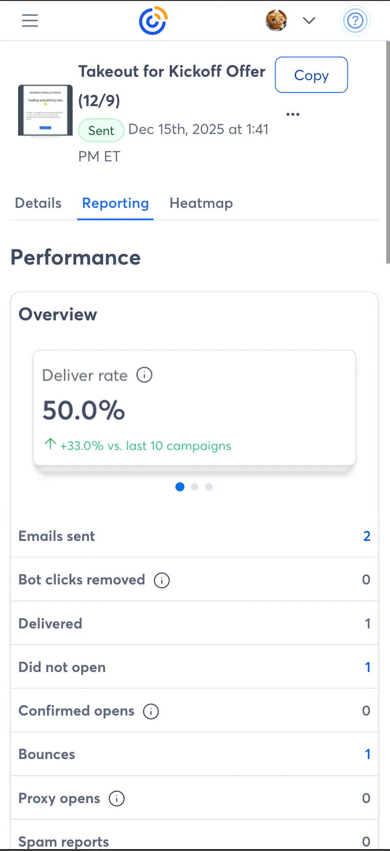 We know that most folks aren't digging into their detailed email reporting on a regular basis, so we're trying to be a little more proactive about how we get insights to you. Starting on April 2nd, 2026 you'll be able to see an insight about your most recent email on the Dashboard right when you log in.