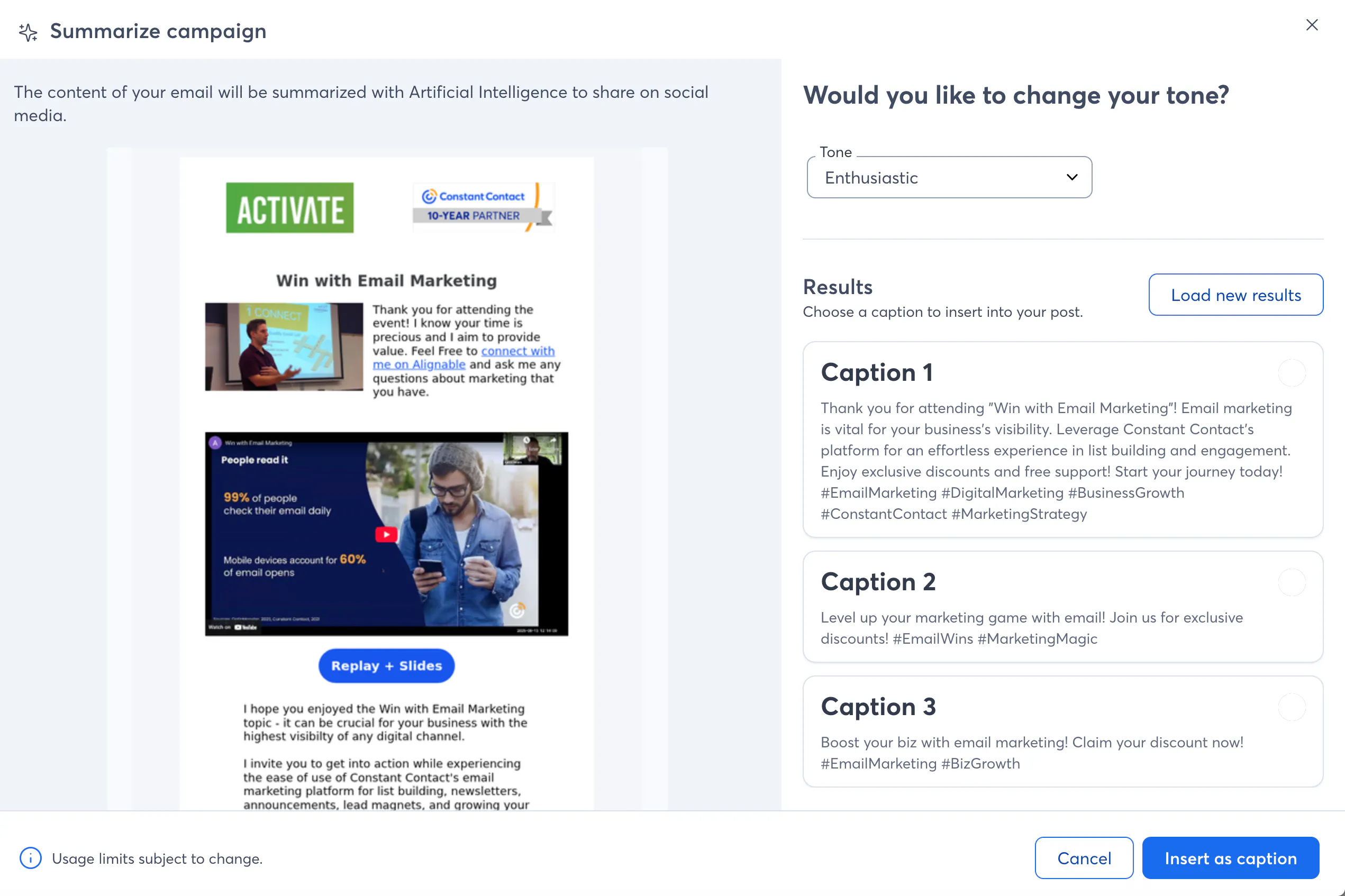 Choose your tone (surprised I chose enthusiastic?!), and then let it draft up three caption ideas, complete with starting hashtags.