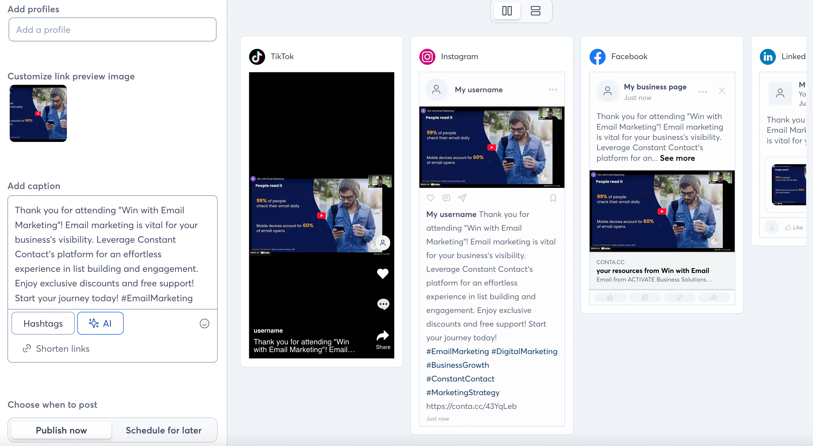 Moving onto the second option, you can publish your own email right into the Social Media post builder within Constant Contact as well by choosing the Post on Social option. This creates a starting draft of social posts with featured images and all the details, which are editable. And of course the "Write with AI" button is always near to help.