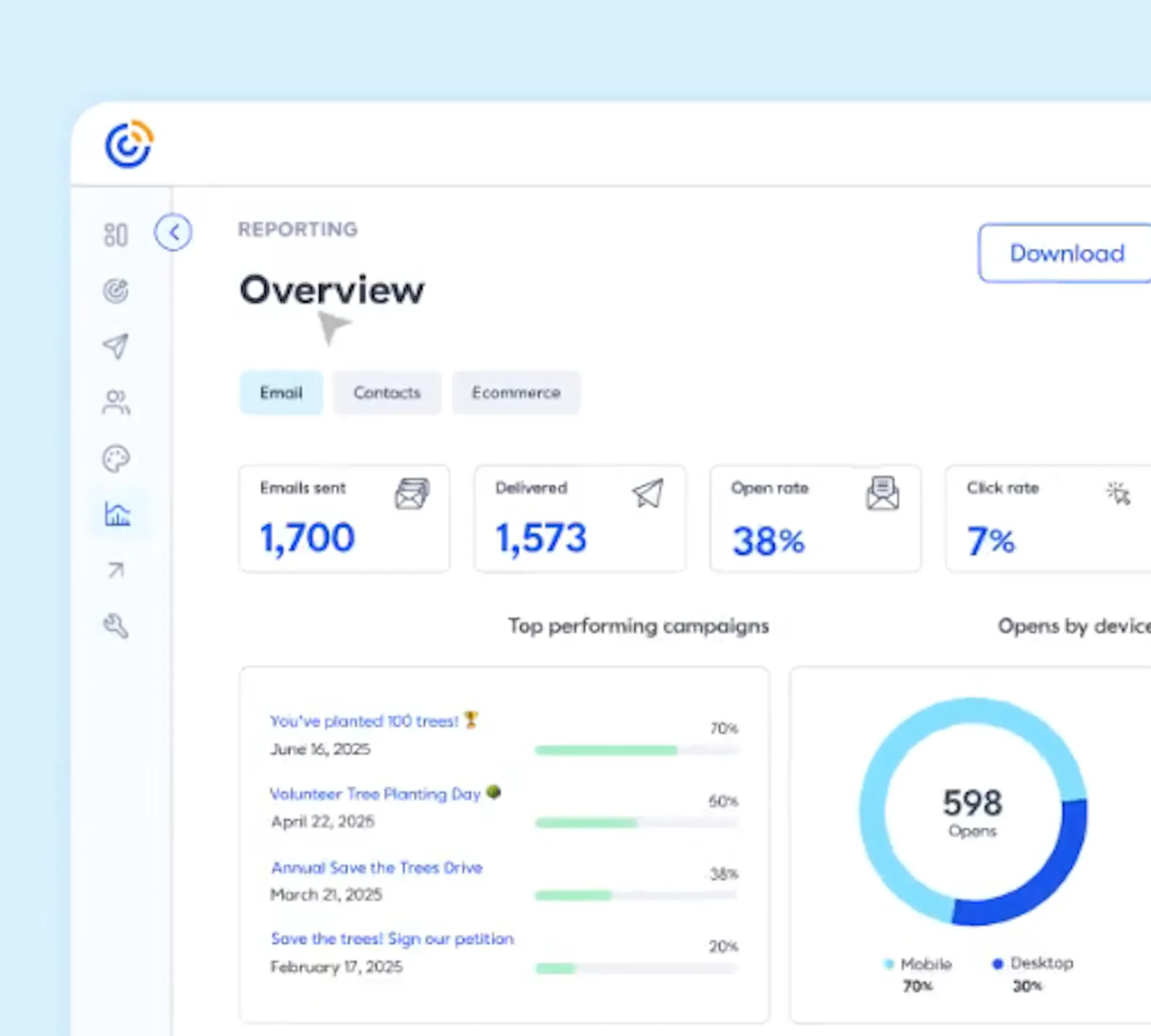 Top menus are now on the left for easy access to marketing channels, tools, contacts, and reports. Expand and collapse groups as needed.