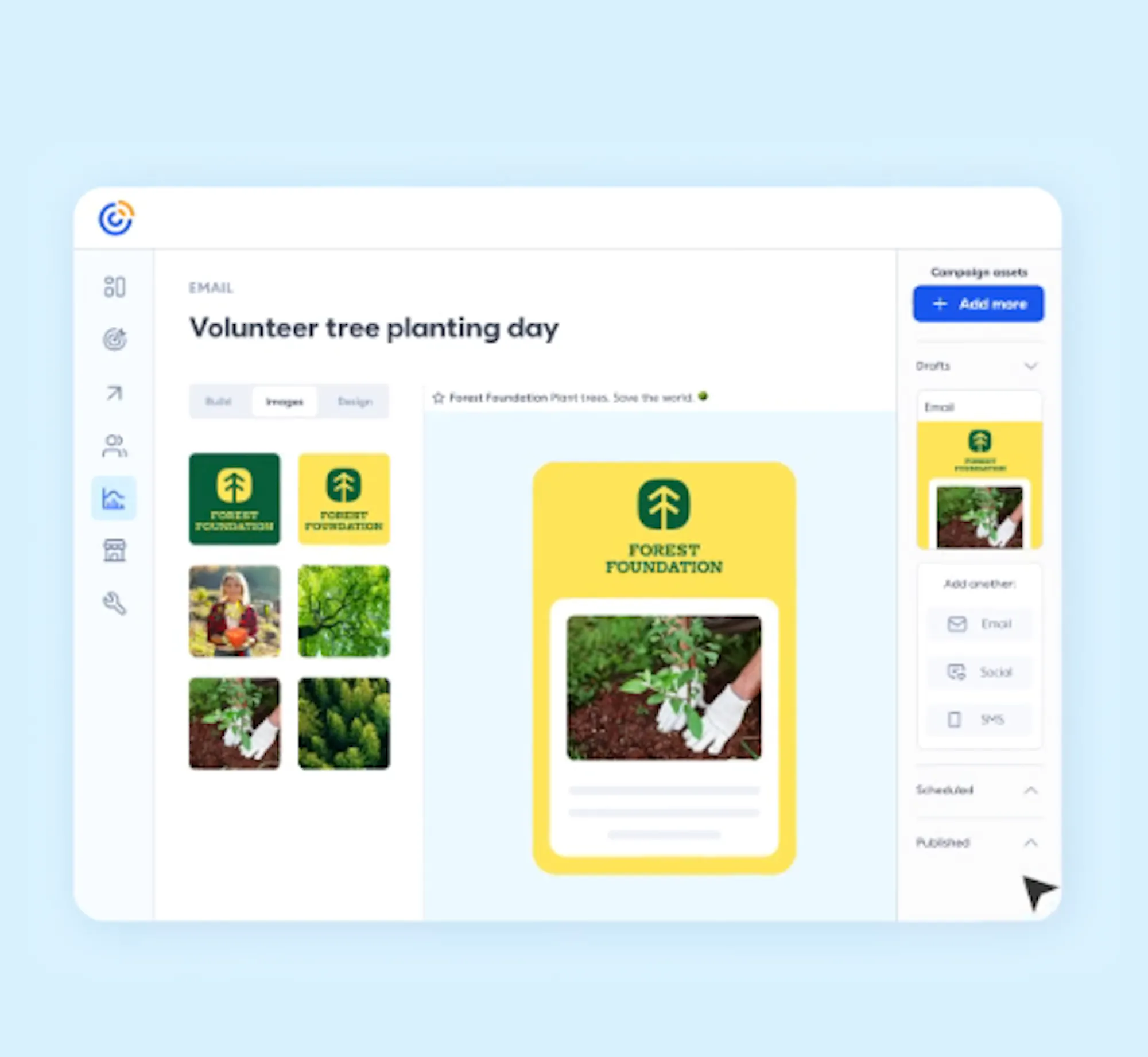 Channel Manager: Quickly add content to campaigns with AI-powered creation, built-in scheduling and simple switching between channels.